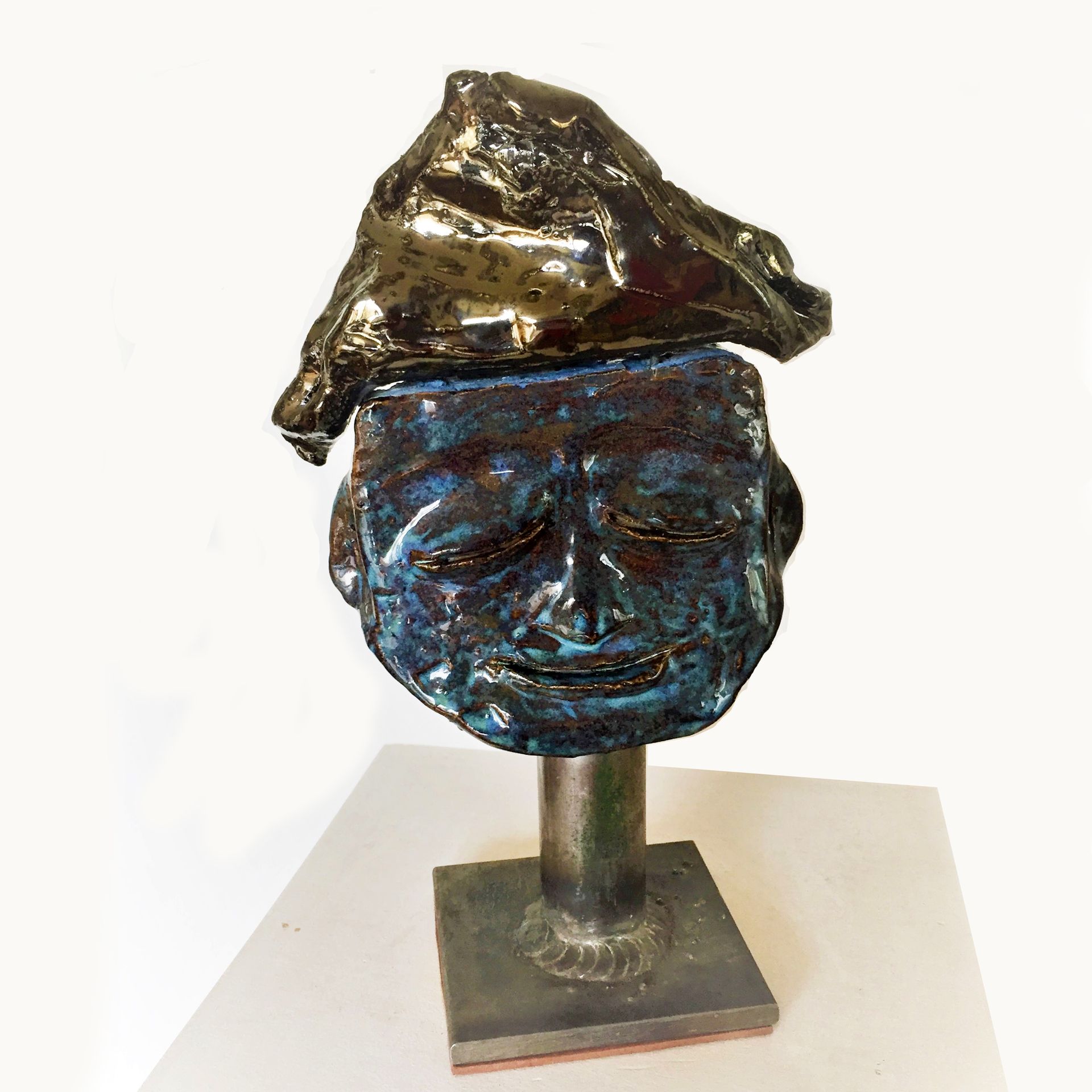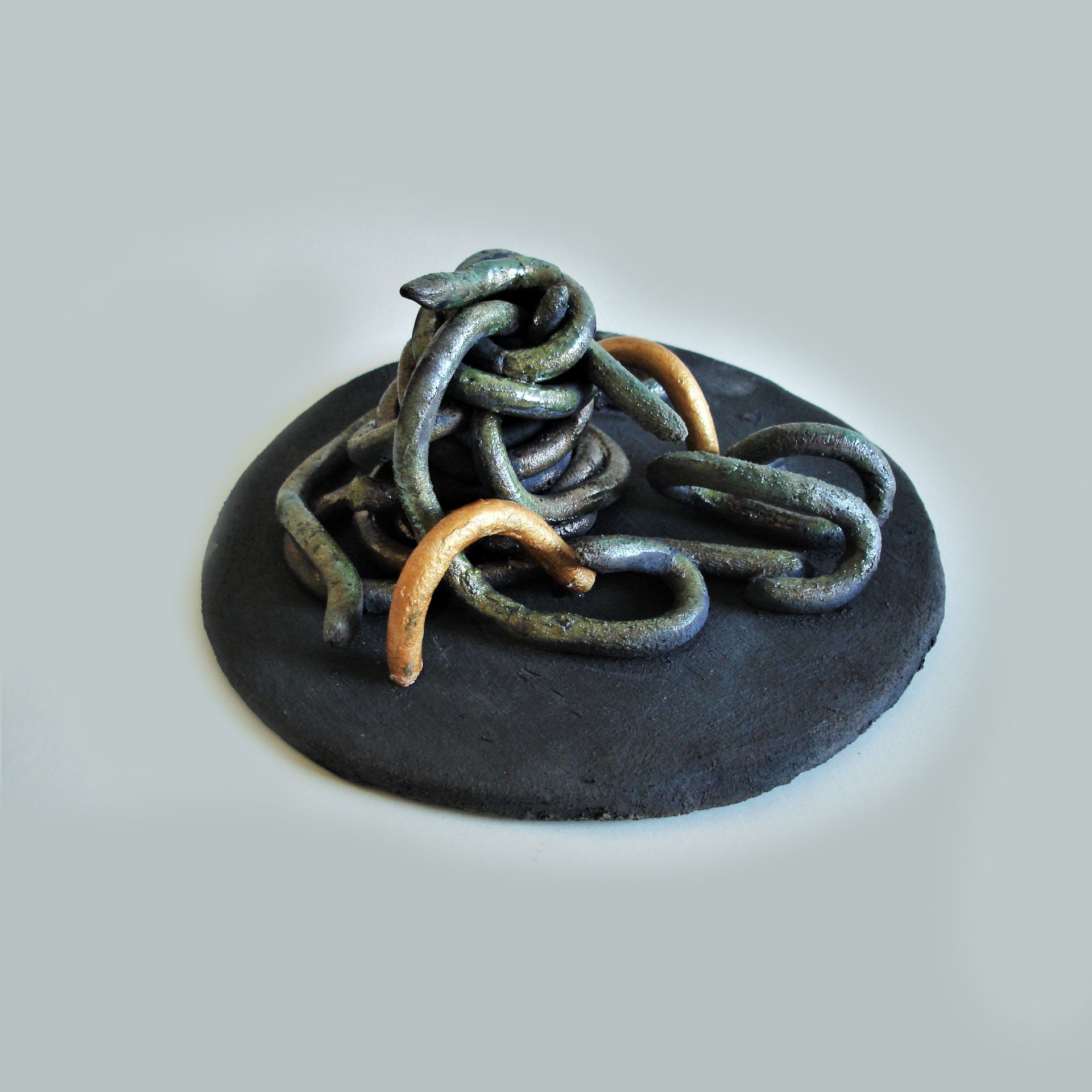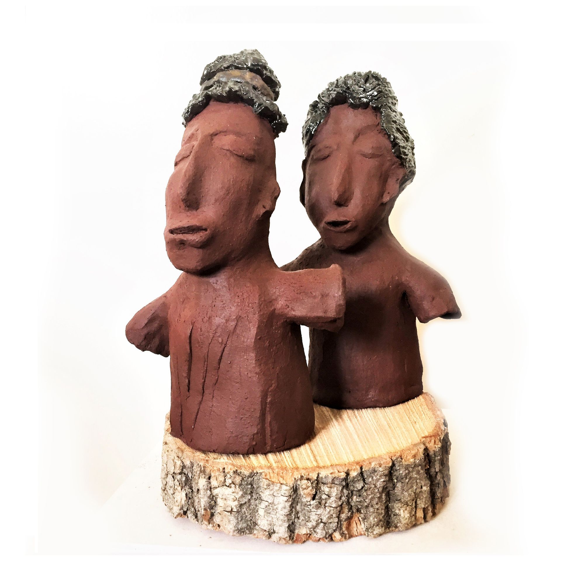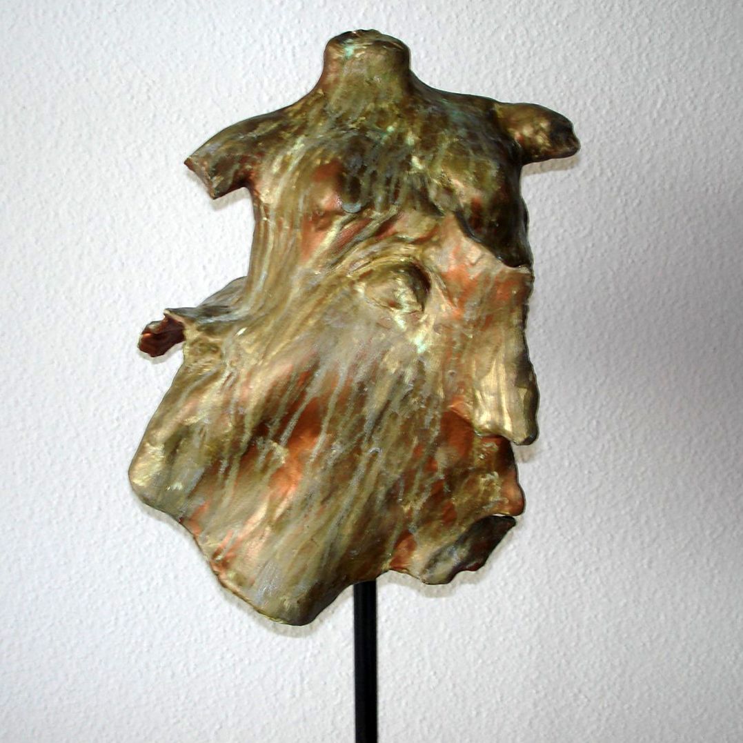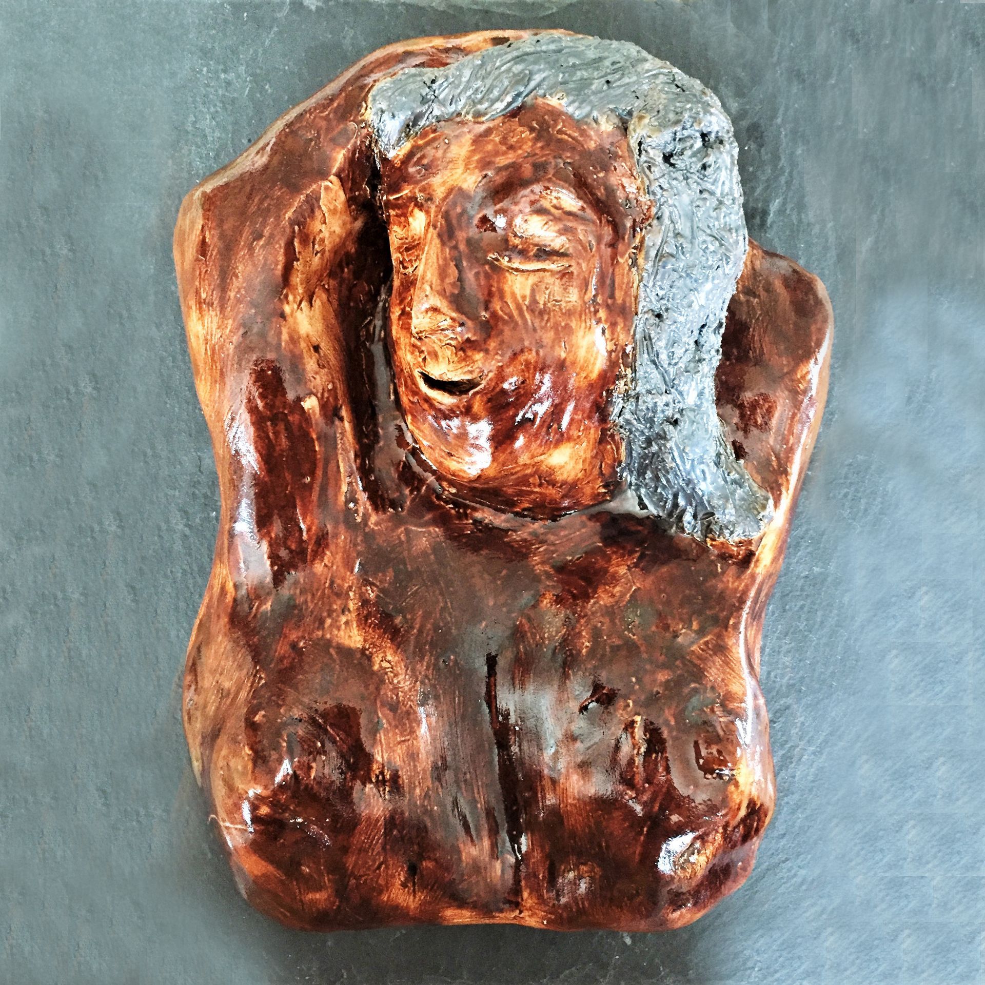 Sowohl bei der Arbeit mit Steinen als auch mit dem Ton füge ich manchmal auch andere Materialien, wie z.B. Metall, Wolle, Holz dazu.